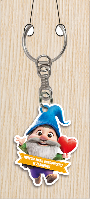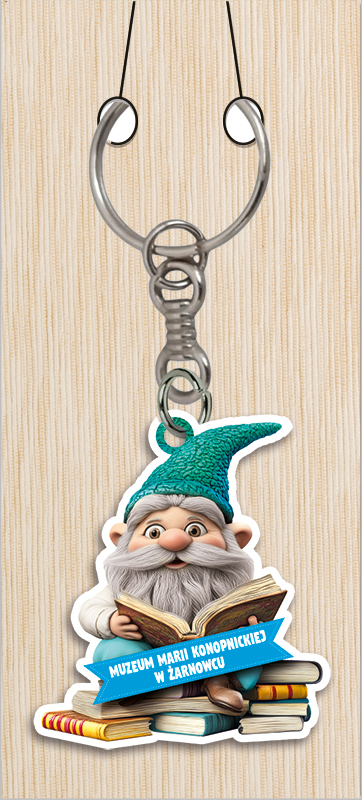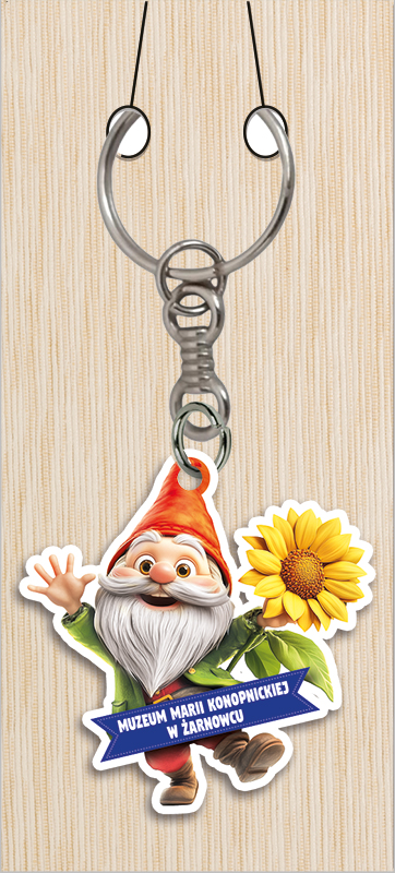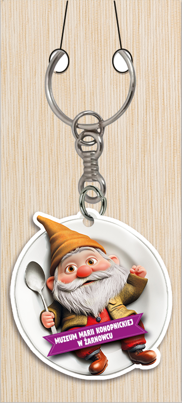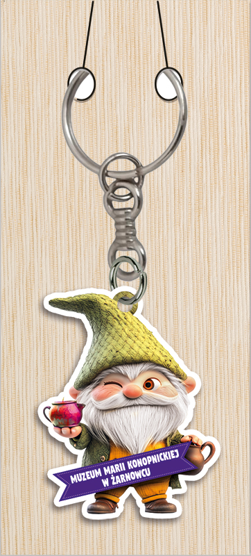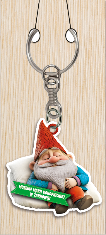 Siedem wzorów zawieszek z krasnoludkami i nazwą Muzeum Marii Konopnickiej w Żarnowcu
